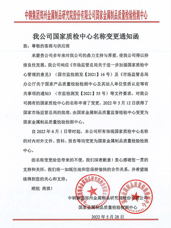 自2022年6月1日零时起,本公司所有体现国家质检中心名称的对内对外文件、资料、报告等均变更为国家金属制品质量检验检测中心。